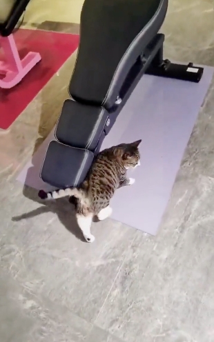 一個名為「@poco3118」的帳在推特上傳一部影片,從畫面中可以看到,有隻虎斑貓在健身房閒晃,在某處停下來後,選在軟墊處躺下,開始進行能練出腹肌的「捲腹」動作,還將腳跨在器材上。