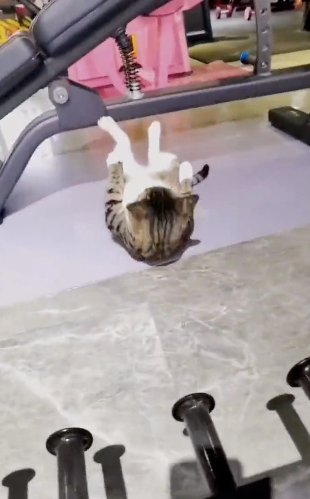 似乎是在健身房待久了,虎斑貓見多識廣,「捲腹」做得相當標準,可能比某些人類還好!
