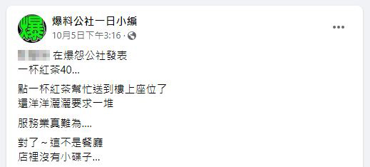 一名网友在脸书社团《爆怨公社》上晒出一张订单并发文抱怨,只见该名客人点了一杯大杯红茶40元,在备注栏却列了一长串的要求,包括「饮料去冰、3片柠檬片装在小碟子、搅拌棒3支、免费大杯柠檬水 (要加冰块和3片柠檬片)、需要列印纸本明细、一大叠擦嘴纸巾、要集点」。