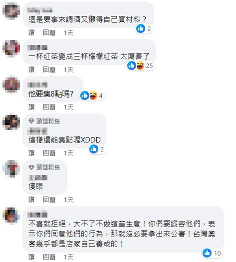 贴文曝光后,网友们也看愣,「一杯40的红茶硬生生被他喝出英式下午茶的仪式感」、「要不要再加个热毛巾湿纸巾 ? 当作在天上人间喝红茶阿?」、「一杯红茶变成三杯柠檬红茶,太厉害了!」、「只能说辛苦了」。不过有人直言,店家若是觉得不合理就该拒绝客人要求,「不喜就拒绝,大不了不做这笔生意!你们要纵容他们,表示你们同意他们的行为,那就没必要拿出来公审!台湾奥客几乎都是店家自己养成的」。