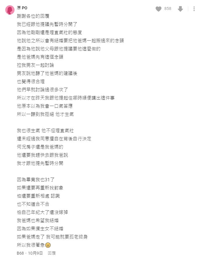原PO聽了很不悅,男友還說是他爸媽先提議,他也很認同,「他們早就討論過很多次了」,沒想到女友會拒絕。原PO也生氣,因為男友態度理所當然,未經同意擅自做決定,「何況房子還是我爸媽的,他還要我趕快去跟我爸說。」原PO選擇先和男友暫時分開,一方面是因此有點不想結婚,但又著急自己31歲要重新找對象相處磨合不容易。