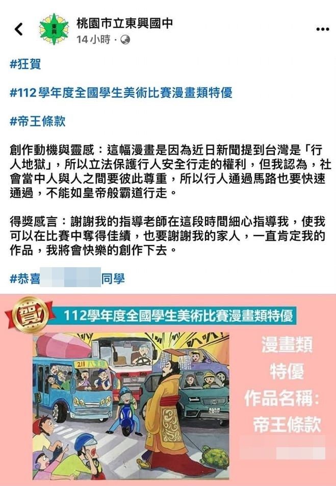 根据媒体《三立新闻网》、《ETtoday新闻云》的报导,桃园东兴国中一名学生参加「112学年度全国学生美术比赛」,以名为《帝王条款》的画作,获得漫画类特优。该名学生的创作灵感,来自近日新闻提到台湾是「行人地狱」,所以立法保护行人安全行走的权利,但他认为人与人还是要互相尊重,行人不该如皇帝般霸道行走,因而选作创作主题。