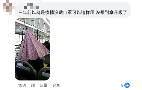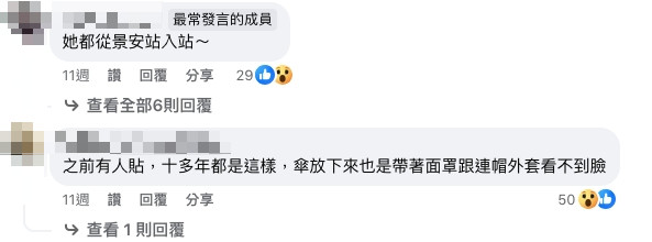 貼文曝光後,不少曾經遇過該名乘客的網友指出「她以前是傘整個打開拿很低遮著臉,常常傘會戳到別人,被捷運工作人員勸導後,後來才改成這樣拿的」、「她都從景安站入站」、「之前有人貼,十多年都是這樣,傘放下來也是帶著面罩跟連帽外套,看不到臉」、「她很兇,還會在傘裡偷吃東西,板南線常常看到」、「有一次搭車人多,我被她的雨傘一直抵住頭,當下以為是人多,下一站有多人下車,這個大姐雨傘還是督過來,超級沒禮貌,當下直接用意念超度她」。