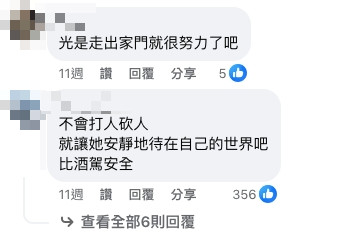 然而,也有人持相反意見,緩頰「她在自己的世界裡,拜託不要打擾她」、「會不會是有社交恐慌症之類的?」、「多一點包容吧!可能是有心理障礙」、「光是走出家門就很努力了吧」、「不會打人、砍人,就讓她安靜地待在自己的世界吧!比酒駕安全」。你有遇過本尊嗎?在哪裡看到的?