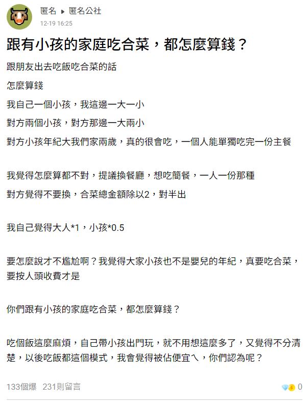 這位家長上論壇《匿名公社》發文求助:「跟有小孩的家庭吃合菜,都怎麼算錢?」原PO和友人A都有孩子,「對方小孩年紀大我們家2歲,真的很會吃,一個人能單獨吃完一份主餐。」雙方打算帶3孩約吃合菜,原PO認為到時候餐費最好能按人頭計費「大人*1,小孩*0.5」,不然就改吃一人一份主餐的簡餐。