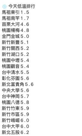 而天气职人吴圣宇也在脸书提到,23日晚间到24日清晨,中北部、东北部地区的低温仍会普遍性的来到6至8度之间,有些地方可能低于6度,南部以及花东地区也有局部10度或以下低温发生机会,但晚间降雨机率预估会逐渐减少,整体水气最多的时间点在23日白天。