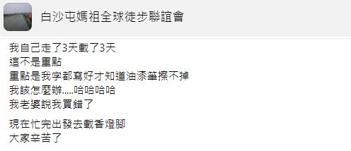 貼文曝光後,網友們全笑翻了,「放著吧,媽祖婆的意思要你明年繼續喔!感恩有你」、「媽祖的旨意不可違」、「不用擦了啦,這樣平常會有很多人跟你招手,多幸福」、「媽祖旨意啦!要你明年繼續來」、「媽祖婆已經把你放進工作人員口袋名單了,旨意就收下吧XD」、「不用擦了,明年繼續」。