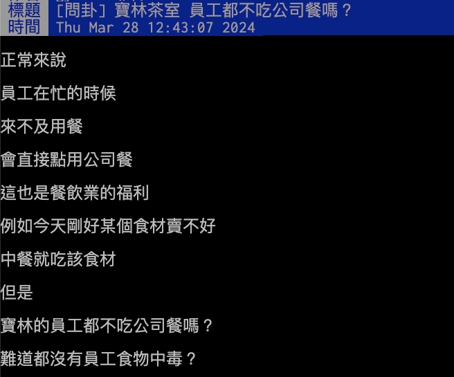 原PO表示,正常來說,員工在忙的時候來不及用餐,會直接點用公司餐,這是餐飲業的福利,例如:今天剛好某個食材賣不好,中餐就吃該食材,「但寶林的員工都不吃公司餐嗎?難道都沒有員工食物中毒?」此外,原PO直言,寶林開業那麼久,理論上同樣的製程、同樣的物料,會食物中毒早就會有案例,但翻閱寶林的評價,還真的未有食物中毒的前例。