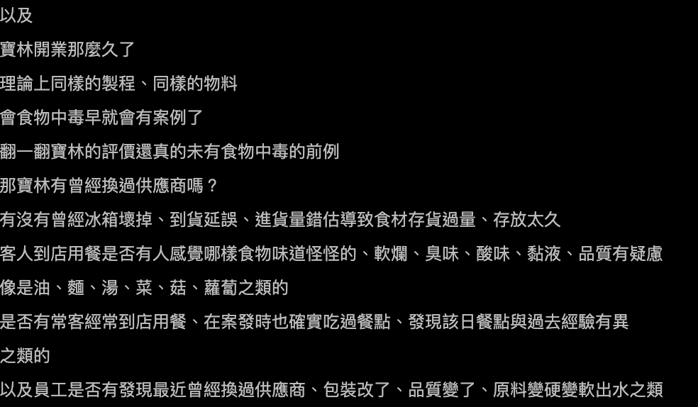 最後,原PO不停地丟出問題,好奇「寶林曾經換過供應商嗎?有無曾經冰箱壞掉、到貨延誤、進貨量錯估導致食材存貨過量或存放太久?」、「客人到店用餐,是否有人感覺哪樣食物味道怪怪的?」、「是否有常客經常到店用餐,在案發時確實吃過餐點、發現該日餐點與過去經驗有異?」或「員工是否有發現,最近包裝改了、品質變了及原料變硬變軟出水之類?」