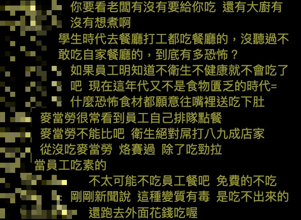 此外,也有內行的人透露,「你做過餐飲就知道,沒人敢吃自己食物」、「你自己去市場挑菜也會挑新鮮的買八」、「很多員工都只會吃肉不吃菜,因為菜隨便洗」、「爛東西自己當然不會吃」。你認為真正原因是什麼呢?