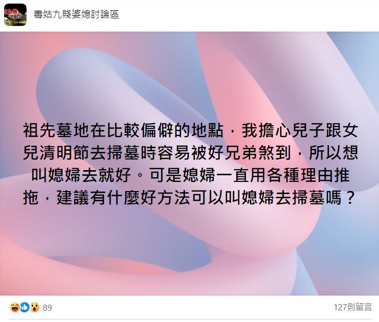 一位網友在臉書社團《毒姑九賤婆媳討論區》指出自家祖墳地點偏僻,「我擔心兒子跟女兒清明節去掃墓時容易被好兄弟煞到,所以想叫媳婦去就好。」這位長輩開口要求媳婦代替自家兒女去掃墓,但媳婦也不願意,所以沒有正面回應。原PO認為媳婦在找藉口,又不知道怎麼講贏對方,於是上網求解:「建議有什麼好方法可以叫媳婦去掃墓嗎?」