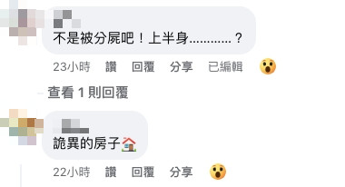 貼文曝光後,網友們嚇得背脊發涼,稱「不是被分屍吧!上半身?」、「只有下半身?」、「太驚悚了」、「誰敢住啊?」、「要去收驚」。