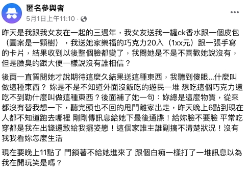 一名男網友在臉書「匿名公社」表示,這幾天是跟女友交往3周年的日子,她送了一罐CK香水跟一個皮包,自己送了大賣場的巧克力20入,一共100多,跟一張手寫的卡片,結果對方收後,臉色都變了,雖然嘴上說「沒有不喜歡」,「但臉臭的跟×便一樣,說沒有誰相信?」