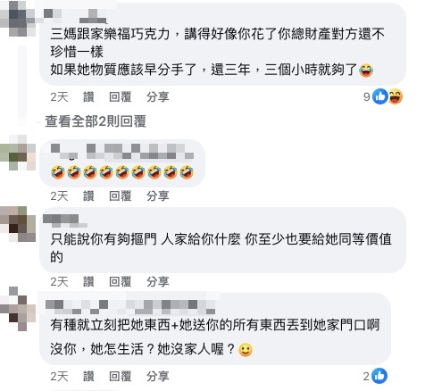 貼文曝光後,原PO討拍慘遭打臉,大家怒不可遏地說「支持女友不要回來」、「你應該單身」、「不要臉的是你吧」、「你是還活在以為送女生金莎巧克力就可以追到的那種年代?」、「只能說你有夠摳門,人家給你什麼,你至少也要給她同等價值的」、「吃個我家牛排都比你的巧克力好」、「你適合單身,不要再殘害女性了」、「像你這種脾氣的,以後一定都是會打人的」。