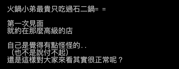 没想到,两人在论要吃什么时,女方就提议,想去吃高级火锅,原PO一查发现,该间店一个套餐竟然高达快2千元,心想「第一次见面,就约在那么高级的店,是觉得有点怪怪的,也不是说付不起。」最后,原PO询问,「还是这样对大家来看,其实很正常呢?」