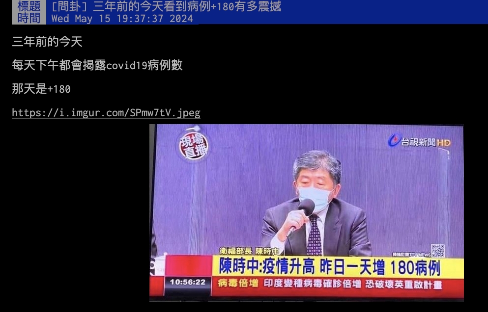 還記得疫情時代的日子嗎?每到下午兩點,衛福部都會舉辦記者會,時任部長陳時中會向大眾宣布當天的病例。轉眼間,已經過去3年,有網友5月15日在PTT以「3年前的今天看到病例+180有多震撼」為題,發表自己的看法。