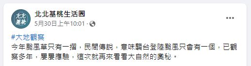 一名网友在脸书粉专《北北基桃生活圈》上分享所见,日前他发现今年台风草只有一折,依据民间传说,这意味袭台登陆台风只会有1个。依据他多年观察的经验屡屡应验,直言「这次就再来看看大自然的奥秘!」