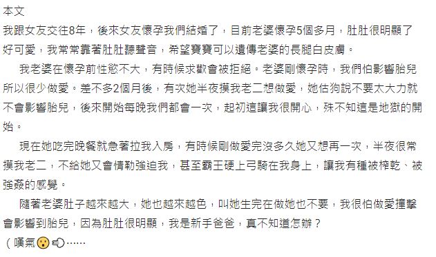 直到老婆懷孕5個月,原PO無奈坦言「起初這讓我很開心,殊不知這是地獄的開始」,因為老婆有時吃完晚餐就急著進房,甚至剛做完沒多久又要1次,半夜還會襲擊他、霸王硬上弓,讓他快要被榨乾,也漸漸開始擔心會影響到胎兒,不知該怎麼辦才好。