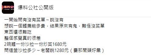 一名網友在臉書社團《爆料公社公開版》上發文抱怨,表示他到雲林西螺一間麵店用餐,一坐下就問有無菜單,結果店家回應沒有,他當下心想「一個麵攤能多貴」。怎料結帳時,這才發現2碗麵、一份沙拉、一份炒菜居然要價1680元,光是沙拉就要1280元,他嚇到當場頭昏眼花。