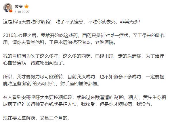 黄安19日在微博晒出疑用健保领取多袋西药的照片,并表示自从2016年心梗后,他便开始吃西药控制,怎料药物带来副作用,永远治标不治本,让他经常跑医院,结果为了治疗心血管疾病,肾脏吃药吃出问题。