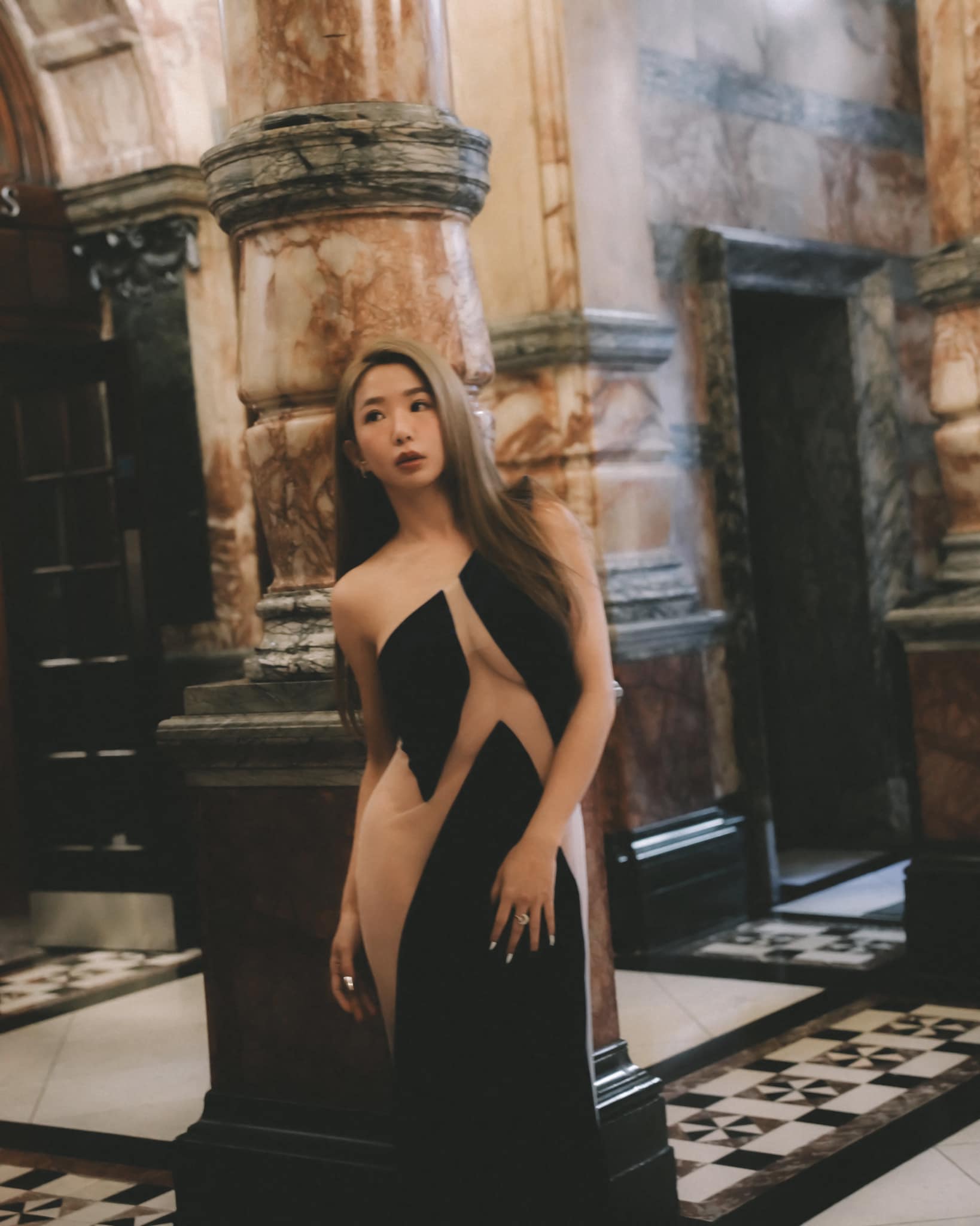 原來郭書瑤前往倫敦參加時裝周,在街頭拍下一系列美照。乍看之下,她的禮服相當前衛,正面僅用三塊布遮住重點部位,幾乎全裸,眼睛真的不知道要往哪看。