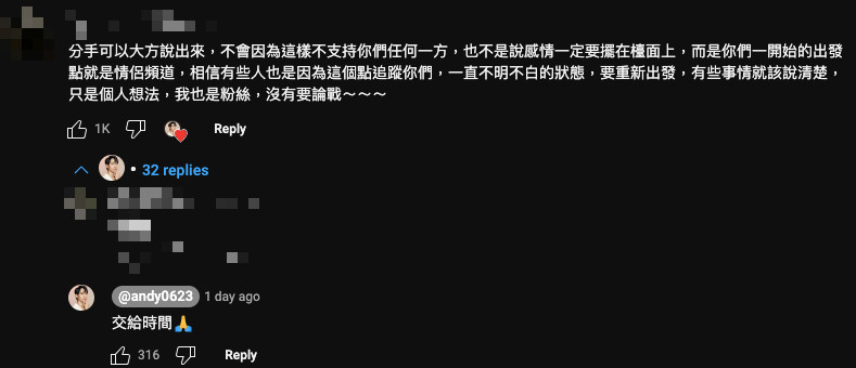 許多粉絲都在下方留言關心,有人回「分手可以大方說出來,不會因為這樣不支持你們任何一方,也不是說感情一定要擺在檯面上,而是你們一開始的出發點就是情侶頻道,相信有些人也是因為這個點追蹤你們,一直不明不白的狀態,要重新出發,有些事情就該說清楚,只是個人想法!」Andy則稱「交給時間」,並附上一個雙手合十的貼圖,沒有正面回應問題。