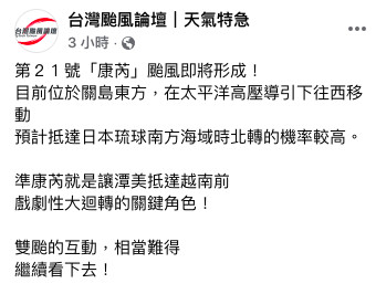 此外,氣象粉專「台灣颱風論壇|天氣特急」也提到,第21號颱風「康芮」即將形成,目前位於關島東方,在太平洋高壓導引下往西移動,預計抵達日本琉球南方海域時北轉的機率較高。