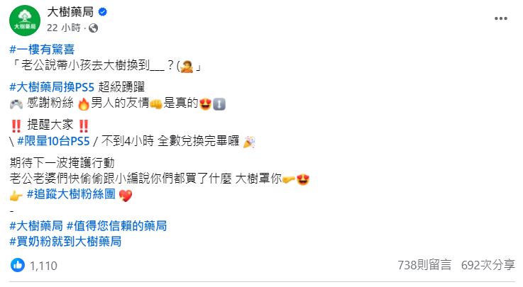 其實Threads人夫拿回家的是PS5 Pro,大樹藥局換購活動送的是PS5 Slim數位版,所以當初人夫並不是真的從藥局換到遊戲機XD 不過這波換購活動仍獲得熱烈響應,大樹藥局後續更新:「限量10台PS5,不到4小時全數兌換完畢囉!」後續還會不會有類似活動?大樹藥局向《NOWnews今日新聞》表示:「會以粉專發佈訊息為主,敬請期待。」