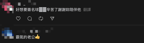 貼文曝光後, 一票人紛紛被小倆口的互動逗樂,笑說「霸氣的老公」、「希望玉米 (林昱珉的綽號) 能身體健康度過每一季,然後順利站穩大聯盟」、「終於!不然玉米可能真的會想打包行李回來給妳養」。