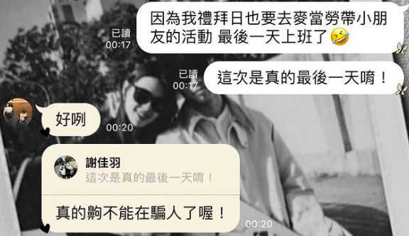 今年7月,林昱珉妻子發文透露,被丈夫唸了一年9個月,終於從麥當勞離職,從高中畢業就半工半讀,還好大學順利畢業,也進入文健站工作,這期間一直都維持打兩份工的生活。