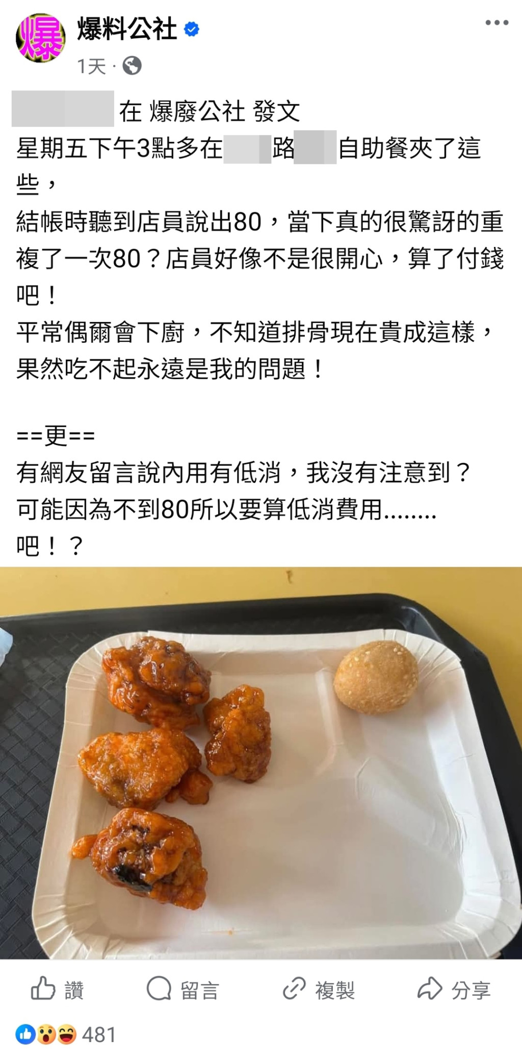 高雄一位網友上臉書社團《爆廢公社》附圖表示,在星期五下午3點去吃自助餐,只盛了4塊糖醋排骨和1顆芝麻球,乾淨的餐盤上還留下很多空間。結帳時店員跟他收80元,「當下真的很驚訝的重複了一次80?店員好像不是很開心,算了付錢吧!」原PO表示自己偶爾也會下廚,無奈感嘆:「不知道排骨現在貴成這樣,果然吃不起永遠是我的問題!」