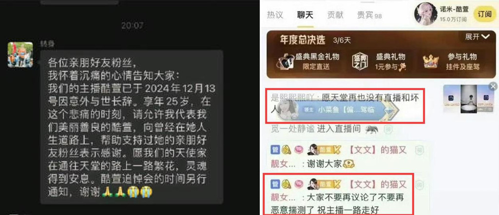 根據《香港01》報導,酷萱最後一次直播的時間為12月13日,下午時段還和粉絲互動,且並無異狀,晚間7點多卻驚傳離世,得年25歲。對此,酷萱的公司宣布,她是因「意外」與世長辭。