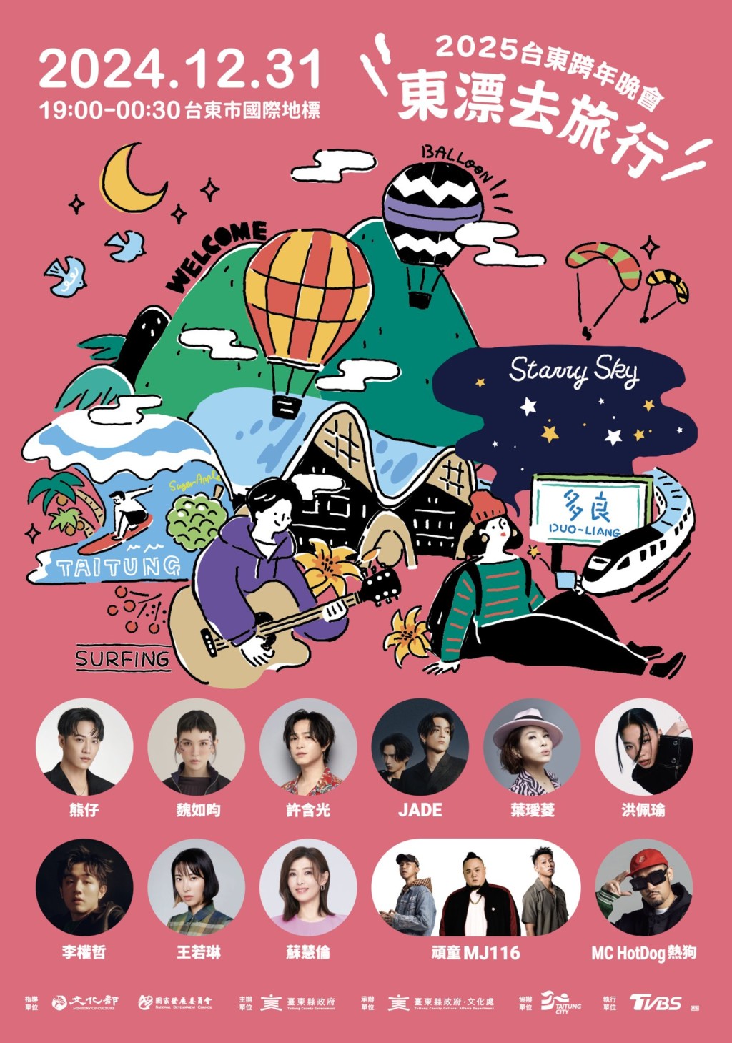 據了解,台東縣政府這次跨年活動除了招商超過80家攤商,晚會還找來MC HotDog熱狗、嘻哈天團頑童MJ116、凍齡女神蘇慧倫、金嗓天后葉璦菱等超過10組天王天后接力演出,更加碼祭出240秒的精彩煙火秀,希望能吸引外縣市的民眾能一同共襄盛舉。