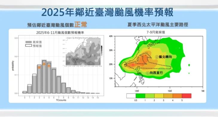 而随着6月过后高压减弱东退、往北移动,南方的「季风低压槽」跟着向北抬升,除了会使台湾在午后出现明显雨势外,环境条件也有利台风发展。气象署就预估,今年下半年西北太平洋将会生成20.8个台风,并有3至5个会接近台湾。