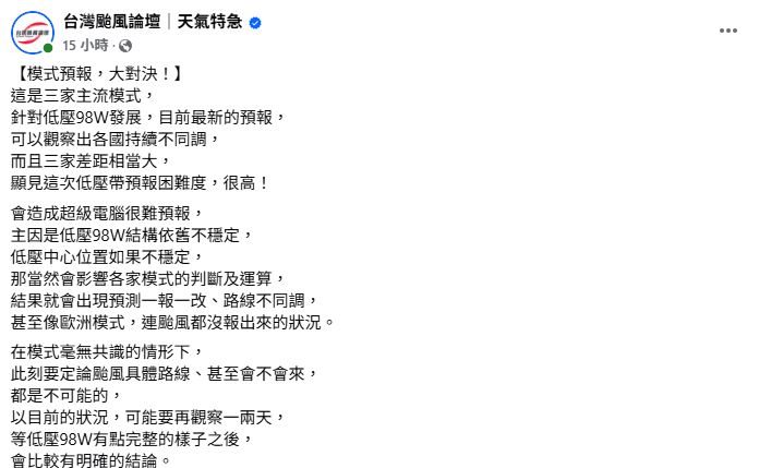 现阶段外界推估98W在下周 (6至11日) 有机会发展成轻台,气象粉专「台湾台风论坛|天气特急」则指出,98W的预报之所以各国模式差距甚大,是因为98W结构还不稳定,影响超级电脑的判断及运算,「结果就会出现预测一报一改、路线不同调」。但98W一旦成形,届时非常有可能已经离台湾陆地很近,预警时间缩短,「有可能会被杀个措手不及」,呼吁民众可提前做好防台准备。