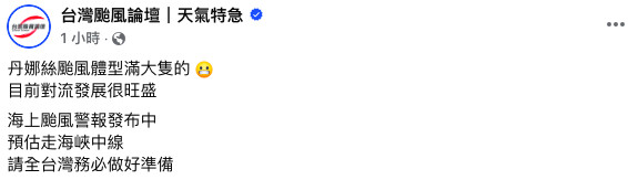 「台灣颱風論壇|天氣特急」再度更新,指出颱風「丹娜絲」的體型滿大隻,目前對流發展很旺盛,海上颱風警報發布中,預估走海峽中線,請全台灣務必做好準備。