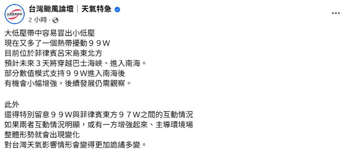 然而現在又多了一個熱帶擾動,氣象粉專「台灣颱風論壇|天氣特急」指出,菲律賓呂宋島東北方再冒出了個小低壓99W,未來3天將穿越巴士海峽、進入南海,有機會小幅增強,且要特別留意99W與97W之間的互動情況,若雙方互動明顯,或一方增強起來、主導環境場,整體形勢就會出現變化,台灣天氣狀況將會變得更加詭譎多變。