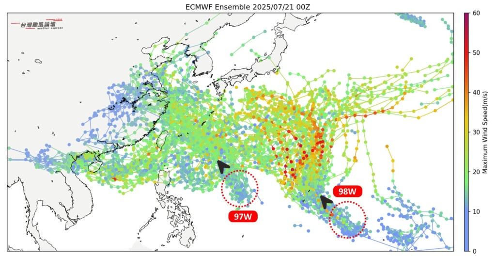 至於颱風動態,熱帶擾動97W、98W已逐漸成形,97W目前強度有增強的趨勢,最快可能周四 (24) 就會發展成颱,未來路徑通過琉球群島再往浙江前進的機率較高。而98W,氣象專家賈新興分析預估於周四 (24)、周五 (25) 間有機會增強為颱風,若2個系統皆成功成颱,屆時雖會形成雙颱局面,但兩者距離遙遠,應不會互相牽引。