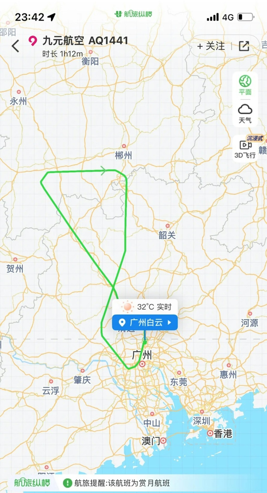 根據媒體《香港01》、《ETtoday新聞雲》的報導,中國網友近日透過航旅軟體,驚見一架「廣州飛廣州」的奇特航班,航班資訊顯示,九元航空AQ1441航班計劃於7月19日凌晨3時05至4時35分,從廣州白雲機場飛往廣州白雲機場。