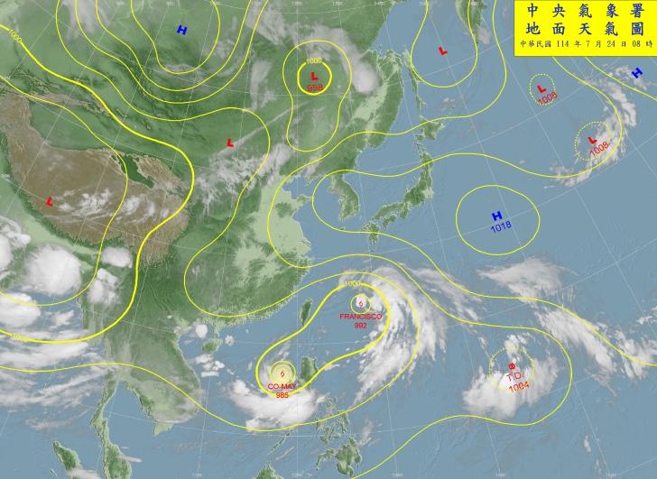 目前太平洋上共有3個熱帶系統,包括輕颱范斯高、竹節草和TD12。范斯高颱風預計今 (24) 日至周五 (25) 會最靠近台灣東北部至北部外海,並為北部帶來明顯雨勢;竹節草颱風則預估將逐漸往東北移動,從台灣東部海域通過。儘管雙颱直接侵台的機率不高,未來也很可能會減弱為熱帶低壓,但其外圍環流仍會對台灣造成影響,民眾還是需留意天氣變化。