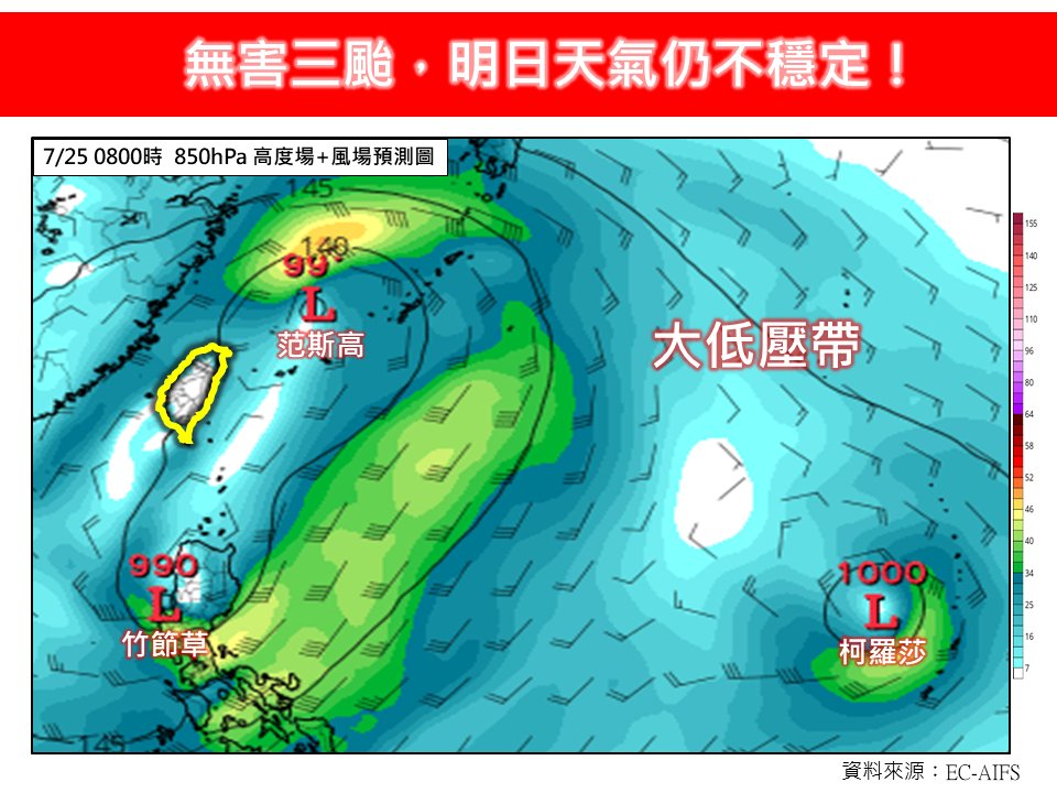 雖然台灣附近一次出現3個颱風,不過林得恩直言是「無害三颱」,路徑上「都像天女散花般技巧性避開臺灣,發佈颱風海警的機會低。」雖然預估颱風不會直接登陸,但整體環境仍受到低壓帶影響。