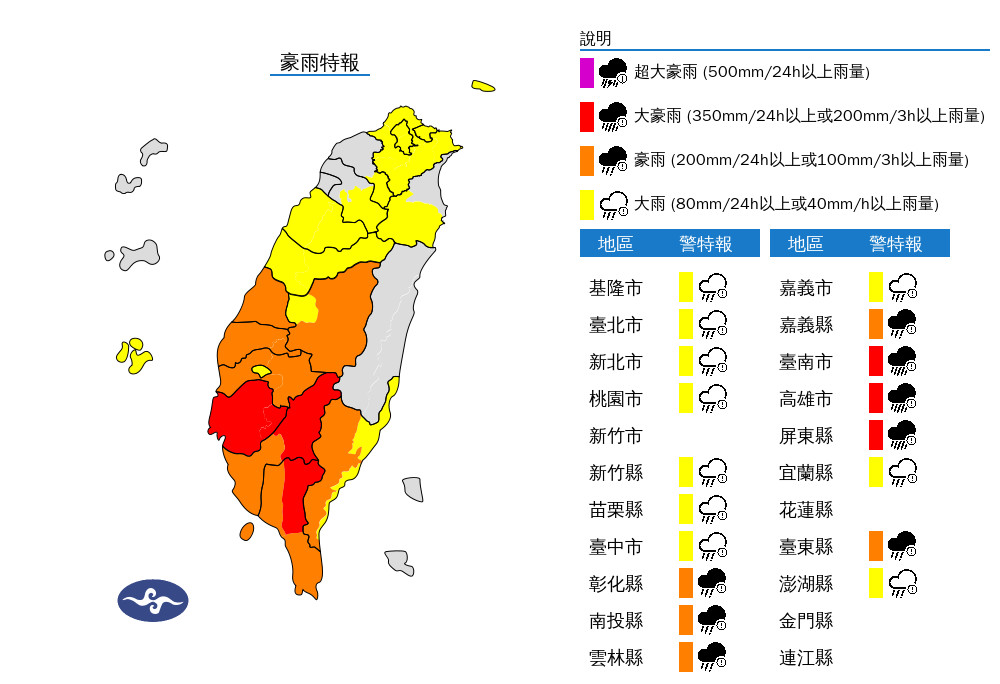 雨势高峰期将持续至下周一 (4) ,林得恩提醒:「苗栗以南有阵雨或雷雨,并有大雨或豪雨发生的机率,尤其是,中南部山区更有局部豪雨等级以上降雨发生的机会,北部及东南部地区偶有局部短暂阵雨或雷雨,而其它地区为多云,午后也有局部短暂雷阵雨。」