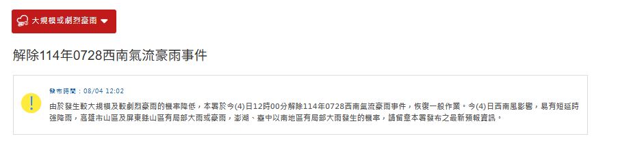 根據媒體《ETtoday新聞雲》、《TVBS》的報導,中南部雨終於要停了!由於西南風逐漸減弱,中央氣象署在稍早已解除大規模豪雨加強作業,不過因環境仍偏西南風,帶來不少水氣,苗栗以南還是會有斷斷續續降雨,但相較前幾日雨勢已明顯趨緩。
