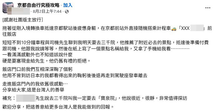 这位善良的网友将温暖故事分享至脸书社团《京都自由行究极攻略》。客人从京都车站搭计程车回饭店,在车上聊隔天要去的景点时,司机也热情推荐,但司机竟然不收车资,「抵达后准备付费跟 (给) 司机,他跟我说请等等,然后在纸上写了一个景点名称给我,又拿了手机给我看……。」即使原PO坚持付钱,司机仍礼貌拒绝。