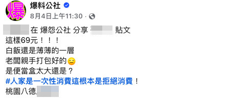 對此,原PO不滿地說「這樣69元!!!白飯還是薄薄的一層,老闆親手打包好的,是便當盒太大還是?人家是一次性消費這根本是拒絕消費!」