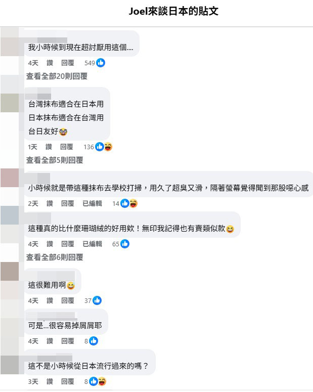 超過1萬網友嘖嘖稱奇,有一派台灣人相當不解:「我小時候到現在超討厭用這個…」、「用久會滑滑的、破破的」、「小時候就是帶這種抹布去學校打掃,用久了超臭又滑,隔著螢幕覺得聞到那股噁心感」、「這很難用啊」、「很難擰乾,桌子擦不乾淨,很容易有味道,而且不好洗乾淨」。
