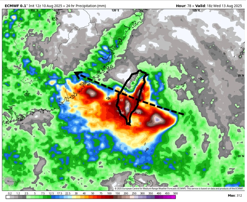 吳聖宇補充,依照現在的路徑預報,颱風「楊柳」的影響應該集中在週三,各地可能會先後經歷一次風雨增強到減弱的過程,由於偏向第3類路徑從花蓮登陸、經過台灣後在中部出海並繼續西進,再加上其本身可能呈現北弱、南強的不對稱結構,所以從模式的24小時累積降雨預報圖顯示,降雨影響最大的區域恐是宜蘭以南、花蓮、台東以及嘉義以南山區。