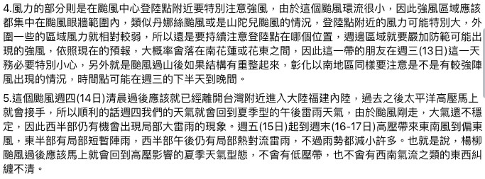 吳聖宇警告,若颱風「楊柳」過山後如果結構有重整起來,彰化以南地區同樣要注意是不是有較強陣風出現的情況,時間點可能在週三的下半天到晚間,而週四清晨過後,其應該就離開台灣附近,進入中國福建省內陸,太平洋高壓馬上就會接手,順利的話,週四就會回到夏季型的午後雷雨天氣,但大氣仍不穩定,所以西半部仍有機會出現局部大雷雨的現象。