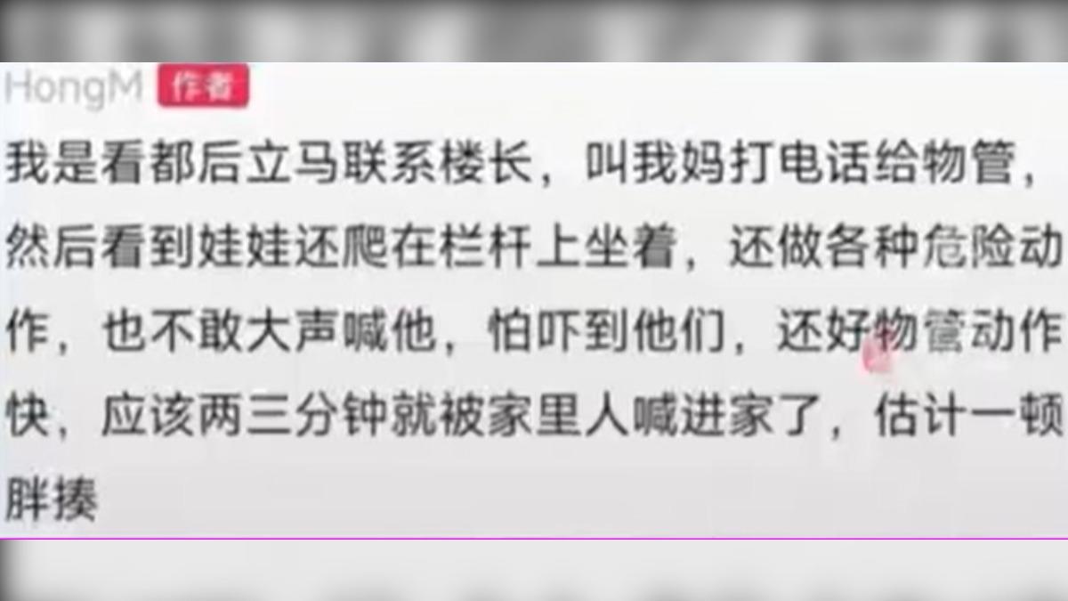 鄰居看到後,驚嚇不已,卻又不敢叫出來,怕嚇到2名幼童,要是他們手一鬆,後果恐怕不堪設想,於是立即聯絡管理員,2分鐘後,家長與保全到場,將他們救起。