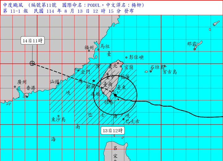 氣象署今 (13) 中午11點半發布海上陸上颱風警報,下午起至晚間嘉義以南地區降雨亦逐漸增加。